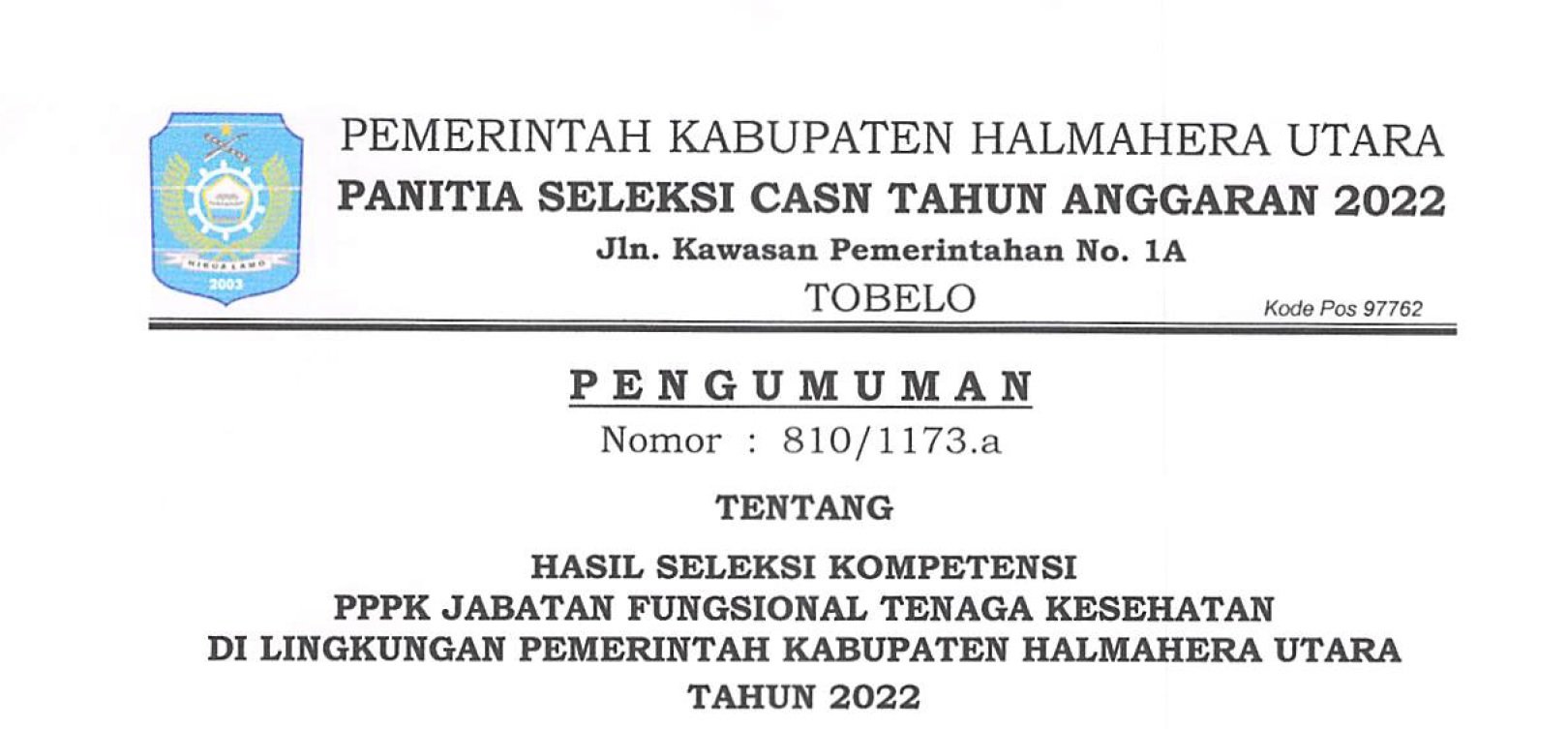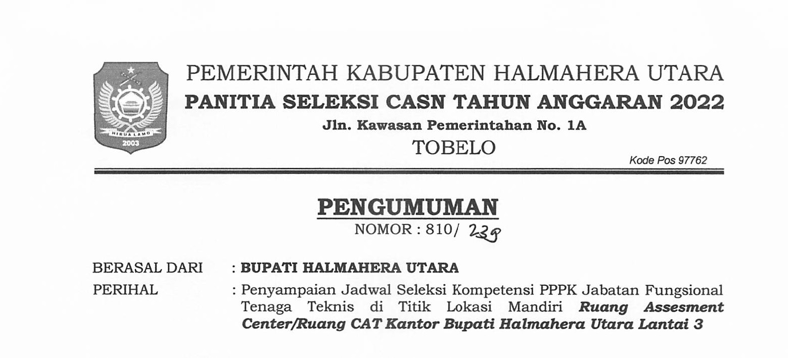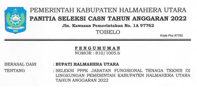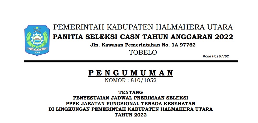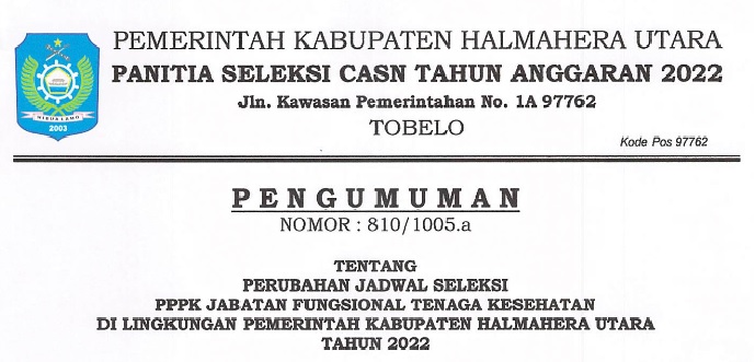 PENGUMUMAN : JADWAL SELEKSI KOMPETENSI PPPK JF TENAGA KESEHATAN KAB. HALMAHERA UTARA 2022 Bkdpsda 05/12/2022 Pengumuman Read More