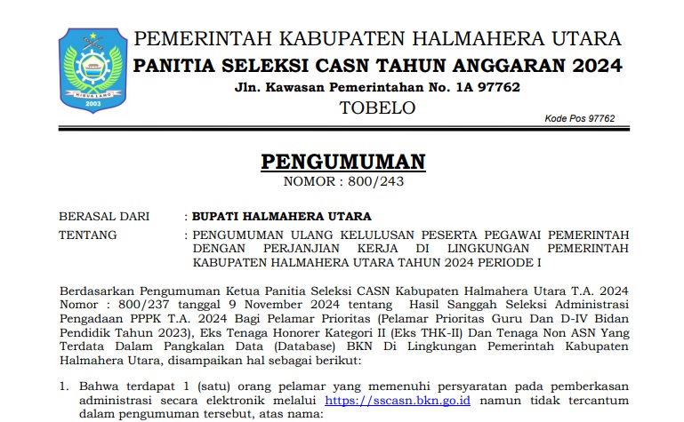 PENGUMUMAN ULANG KELULUSAN PPPK KABUPATEN HALMAHERA UTARA TAHUN 2024 PERIODE I Bkdpsda 14/11/2024 Pengumuman Read More