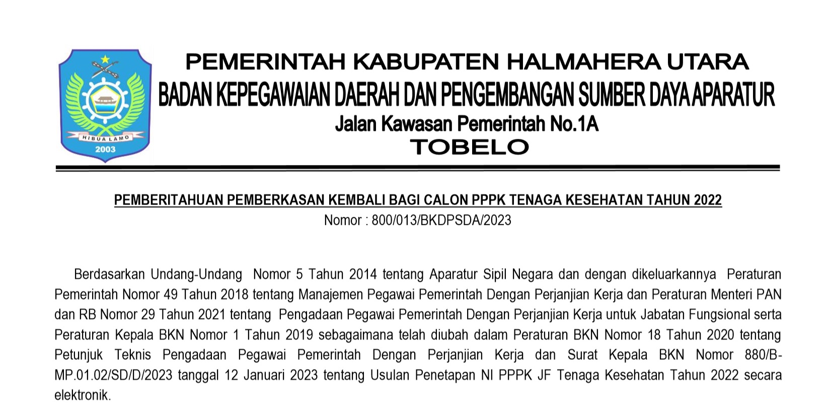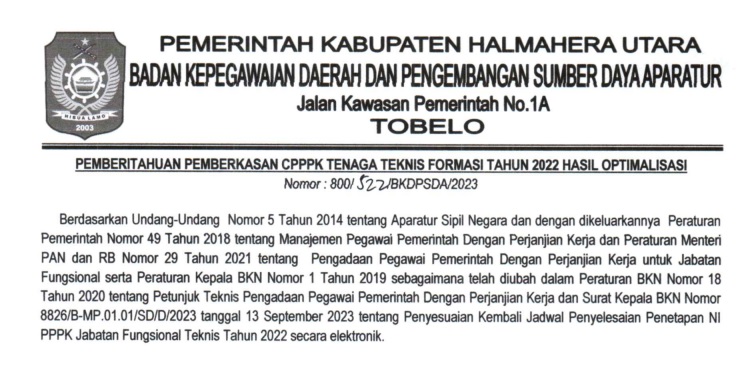 PENGUMUMAN : HASIL SELEKSI ADMINISTRASI PPPK LINGKUP PEMERINTAH KABUPATEN HALMAHERA UTARA T.A. 2023 Bkdpsda 17/10/2023 Pengumuman Read More