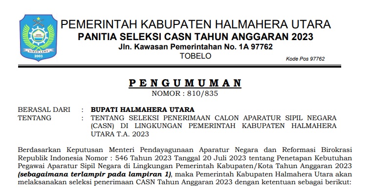SELEKSI CPNS DI LINGKUNGAN PEMERINTAH KABUPATEN HALMAHERA UTARA TAHUN ANGGARAN 2024 Bkdpsda 19/08/2024 Pengumuman Read More