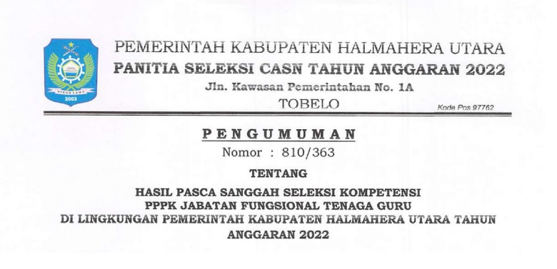 PENGUMUMAN : HASIL PASCA SANGGAH SELEKSI KOMPETENSI P3K GURU PEMDA HALMAHERA UTARA Bkdpsda 15/04/2023 Pengumuman Read More