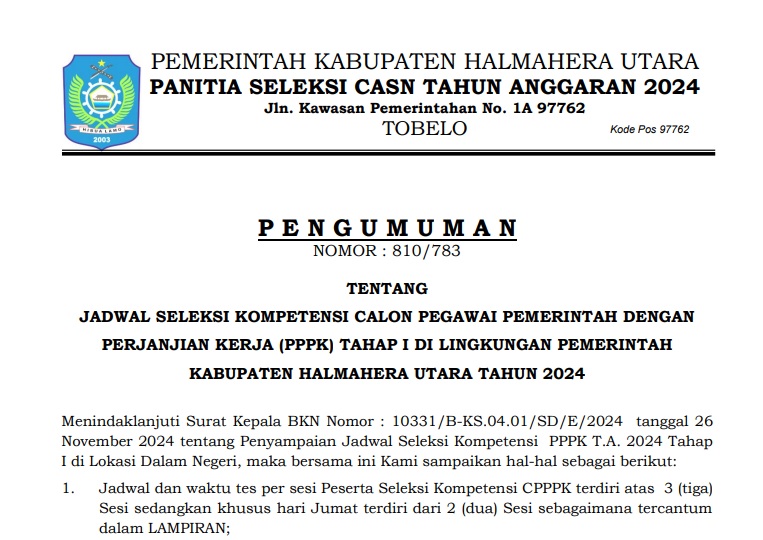 JADWAL SELEKSI KOMPETENSI CALON PPPK TAHAP I KAB. HALMAHERA UTARA TAHUN 2024 Bkdpsda 30/11/2024 Pengumuman Read More
