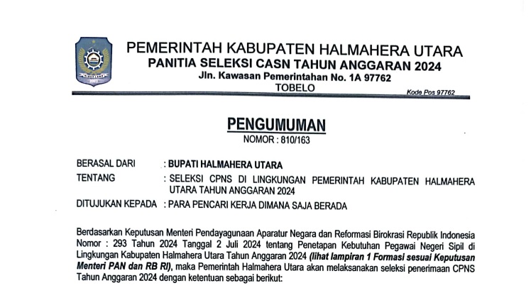 Menindaklanjuti Surat Wakil Kepala Badan Kepegawaian Negara selaku Ketua Tim Pelaksana Seleksi Nasional Pengadaan CASN 2024 Nomor : 3776/B-KS.04.03/SD/K/2025 tanggal 21 Juni 2025 perihal Penyampaian Hasil Seleksi Kompetensi PPPK Tenaga Teknis Tahun Anggaran 2024, Surat Wakil Kepala Badan Kepegawaian Negara selaku Ketua Tim Pelaksana Seleksi Nasional Pengadaan CASN 2024 Nomor : 3713/B-KS.04.03/SD/K/2025 tanggal 21 Juni 2025 perihal Penyampaian Hasil Seleksi Kompetensi PPPK Tenaga Kesehatan Tahun Anggaran 2024, Surat Wakil Kepala Badan Kepegawaian Negara selaku Ketua Tim Pelaksana Seleksi Nasional Pengadaan CASN 2024 Nomor : 5235/B-KS.04.03/SD/K/2025 tanggal 28 Juni 2025 perihal Penyampaian Hasil Seleksi Kompetensi PPPK Tenaga Guru Tahun Anggaran 2024, dan Surat Wakil Kepala Badan Kepegawaian Negara selaku Ketua Tim Pelaksana Seleksi Nasional Pengadaan CASN 2024 Nomor : 5814/B-KS.04.03/SD/K/2025 tanggal 29 Juni 2025 perihal Penyampaian Hasil Seleksi Kompetensi PPPK Tenaga Teknis Tahun Anggaran 2024 di Lingkungan Pemerintah Kabupaten Halmahera Utara, dengan ini Kami informasikan hal-hal sebagai berikut: